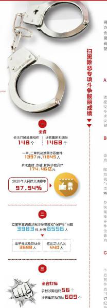 严厉整治“村霸”问题。依法严厉打击把持基层政权、操纵破坏基层换届选举、插手村级事务、垄断农村资源、侵占集体资产等涉黑涉恶违法犯罪。全省打掉农村涉黑组织56个、涉恶集团和团伙609个,“村霸”问题得到全面惩治。