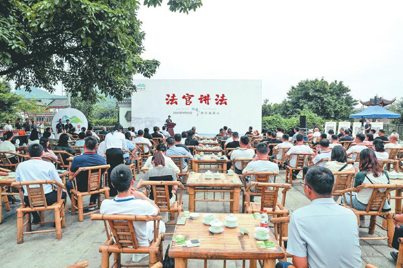 2023年9月20日,一场“法官讲法”现场普法活动在峨眉山市黄湾镇天景社区拉开帷幕,观众席中有一批特殊的客人,他们是来自内蒙古、湖南、广东、广西、海南、四川代表团的37名全国人大代表。这场贴近群众、互动热烈的“法官讲法”获得了代表们的高度评价,大家纷纷点赞,认为活动“形式很新颖、很接地气,很有感染力,希望在全国范围内进行深入推广”。据悉,“法官讲法”是乐山法院助推基层社会治理的创新实践。