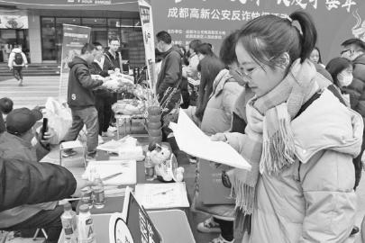 本报讯(四川法治报全媒体记者 刘冰玉)“同志,恭喜你回答对了所有问题,这是你的警察小熊。”“警察叔叔,我转糖画转了一个‘诈’字,但是我好想要那条龙呀!”猜灯谜、转糖画、自制棉花糖、趣味投壶、有奖答题……春节将至,成都市公安局高新区公安分局推出“反诈快闪”系列活动。16日,快闪第一站活动在天府三街新希望广场亮相,现场吸引了一千余名市民参加。