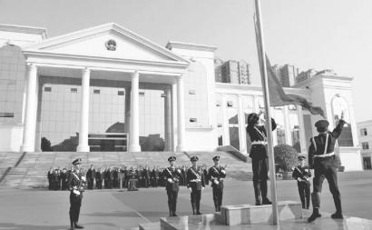 18日10时,眉山中院全体干警在办公楼前整齐列队,由司法警察组成的国旗护卫队护送国旗至旗台,五星红旗在庄严的国歌声中冉冉升起。全体干警着装整齐,精神饱满,行注目礼。