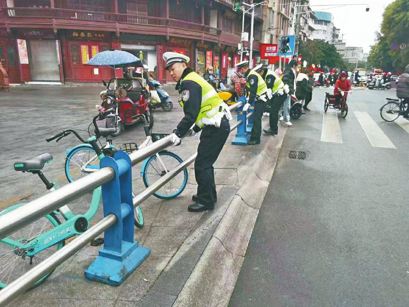 眉山公安交警直属二大队民警摆放护栏