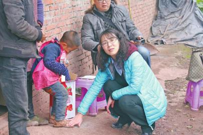 2017年在马边彝族自治县走访时,王玉看到孩子穿着凉鞋,便蹲下用手感受孩子的体温 受访者供图