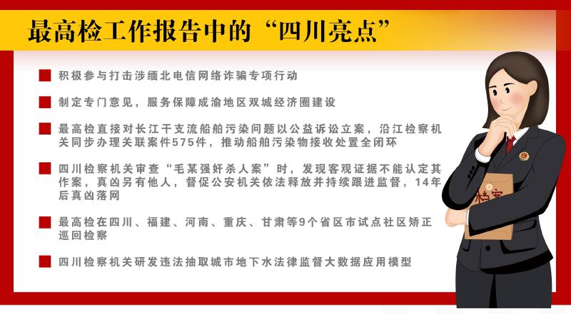 3月8日,第十四届全国人大二次会议举行第二次全体会议,最高人民检察院检察长应勇作最高人民检察院工作报告。记者注意到,四川检察机关在打击涉缅北电信网络诈骗、服务保障成渝地区双城经济圈建设、推动长江干支流船舶污染物接收处置全闭环、深化刑事审判监督、扎实开展社区矫正巡回检察试点工作、推进数字检察赋能法律监督6个方面的工作被报告提及,成为今年最高检工作报告中引人瞩目的“四川亮点”。