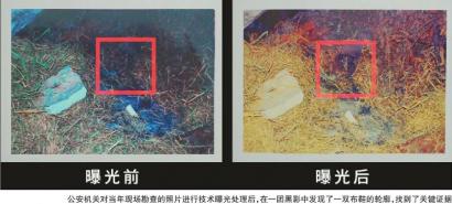 收到这一线索后,公安机关立刻开始行动,在当年现场勘查的胶片中反复搜寻,却并未找到这一关键证物。失望的雷文莉几乎想重新寻找线索。直到三周后,公安民警将所有勘查照片进行技术曝光处理后,在一团黑影中发现了这一双布鞋的轮廓。自此,完整的证据链形成。