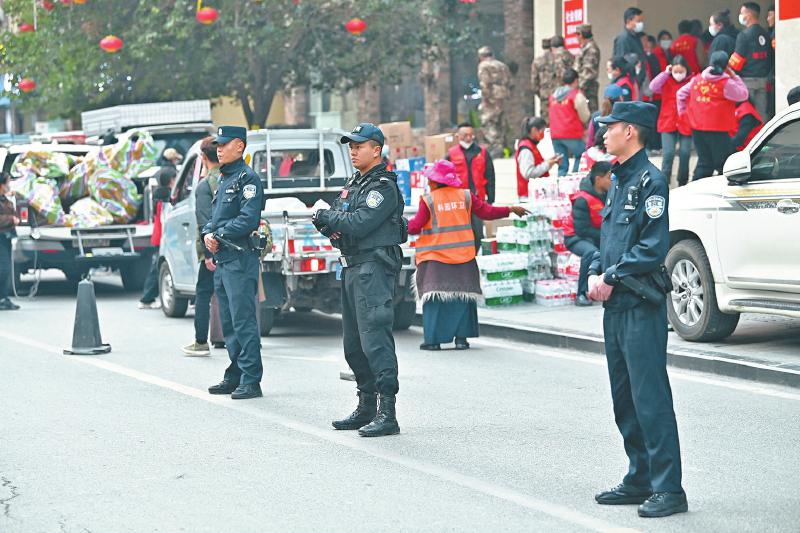 “无关人员请迅速离开主干道,请所有救援车辆依次有序通行,救援物资请有序摆放至县政府门口。”3月18日下午,雅江县公安局刑警大队大队长林强和同事们正在木雅广场开展交通秩序维护、救援物资分配保障、社会治安管理等工作。