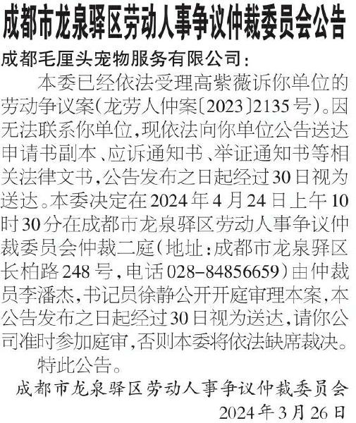 ·成都市龙泉驿区劳动人事争议仲裁委员会公告