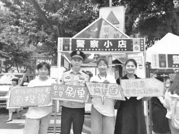 本报讯(四川法治报全媒体记者 刘冰玉)“电信网络诈骗了解一下。”“‘警察小店’3.0上新了,了解一下。”……22日,成都玉林街头,一阵清脆稚嫩的“叫卖声”引得大家从四面聚来。原来成都市公安局高新区分局芳草街派出所“警察小店”3.0版上新了,成都七中初中学校(锦城校区)学生变身“反诈小卫士”,与高新区公安分局反诈中心及芳草街派出所民警一起开展反诈宣传。