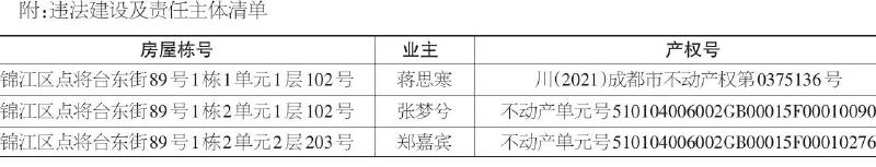 成都市锦江区点将台街89号上行汇锦小区违法建设责任主体(详情附清单):你位于成都市锦江区点将台街89号上行汇锦小区的房屋在产权面积外扩建的建(构)筑物,不能出示相关规划审批等合法手续,违反了《中华人民共和国城乡规划法》第四十条之规定。根据《成都市违法建设查处工作规定》,我局已于2024年3月29日发出限期自行拆除违法建设决定公告,如你(单位、个人)对此有异议,可自公告之日起5日内到我局进行陈述申辩,逾期未至视为放弃陈述申辩权利,以我局调查为准,不影响案件的调查和处理。我局将依法作出强制执行决定。