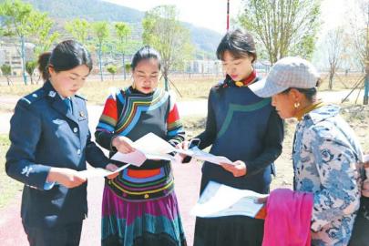 喜德法院巾帼志愿服务队身着法院制服与彝族服饰进行普法宣传