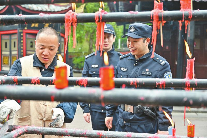 “婆婆,烧完香切记不要将明火带进殿,更不能在寺院内燃烧蜡烛和纸钱。”在峨眉山脚下的报国寺,森林防灭火宣传队队员对前来烧香礼佛的群众说道。