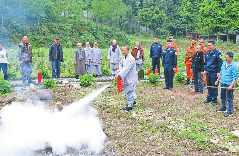 “寺庙文物古建筑是历史和文明的见证,它们能够承受千年的沧桑岁月,却也是脆弱的,一旦发生火灾,便会造成无法估量的损坏。”在峨眉山景区的主要寺庙,队员们组织开展了形式多样的森林防灭火主题宣传会。向僧众及寺庙工作人员详细介绍了防灭火相关常识和技巧,并重点针对寺庙特点,就如何预防和扑救初期火灾、如何组织人员疏散逃生等情况开展实践教学。同时,还对寺庙的消防设施进行检查,并对重点部位的消防安全隐患进行了逐一排查。