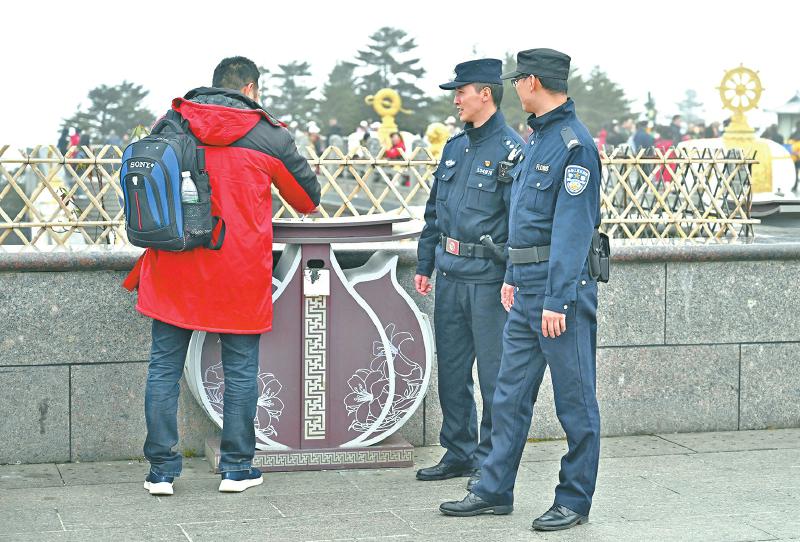 金顶派出所副所长欧洋劝导游客在峨眉山景区禁止吸烟