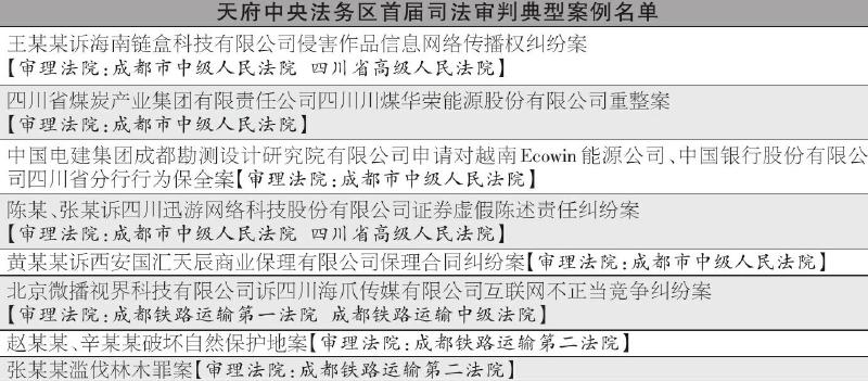 据省高院相关负责人介绍,为充分发挥司法典型案例的示范引领作用,省高院面向入驻天府中央法务区的专业审判庭征集了近年审结的裁判结果公正、对法务区建设具有典型意义的案例。经广泛征集和研究决定,最终评选出“王某某诉海南链盒科技有限公司侵害作品信息网络传播权纠纷案”等8件案件作为天府中央法务区首届司法审判典型案例。入选案例包括信息网络传播权纠纷、涉外保函纠纷、证券虚假陈述责任纠纷、保理合同纠纷、不正当竞争纠纷、破坏自然保护地罪、滥伐林木罪等。入选案例在创新驱动发展、统一裁判规则、完善审理机制等方面发挥示范引导作用,为优化法务区司法供给能力,推动法务区高质量发展作出积极贡献。例如,多起全国首例示范性案例入选,包括针对数字藏品交易行为法律性质认定案、涉互联网短视频账号违规买卖行为案、破坏自然保护地罪案等。下一步,全省法院将持续围绕法务区中期建设目标,在创新驱动发展、统一裁判规则、完善审理机制等方面发力,加快共建共享,释放集聚效能,为高质量发展、高水平开放提供法治保障。