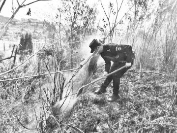 原来,在几日前,大英监狱附近的山坡突发山火,一时间浓烟滚滚、火势迅速蔓延。大英监狱特警队迅速响应,带上灭火装备,前往火情现场。民警观察研判火势后,确定了以水灭火、空地配合、分段封控、整体合围等战术,熟练操作灭火设备,并使用伐木油锯开辟空地阻隔燃烧,和武警官兵、公安民警经过半个多小时的共同努力,成功将明火扑灭。