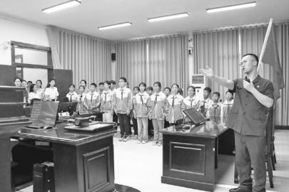 法官向学生们讲解国徽、法徽、天平、法槌等所代表的意义威远县法院供图