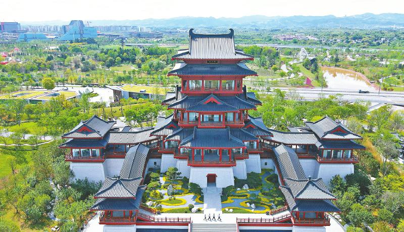 成都世园会园区警务队队员们在锦云楼前巡逻