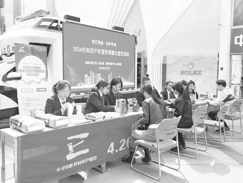本报讯(四川法治报全媒体记者王一多)22日下午,成都市锦江区春熙路北口好不热闹,这里开进了一辆“重庆号”车载法庭车。当天,四川省成都市锦江区法院与重庆市渝中区法院以“智汇锦渝·知护双城”为主题联合开展知识产权宣传周法律咨询活动。