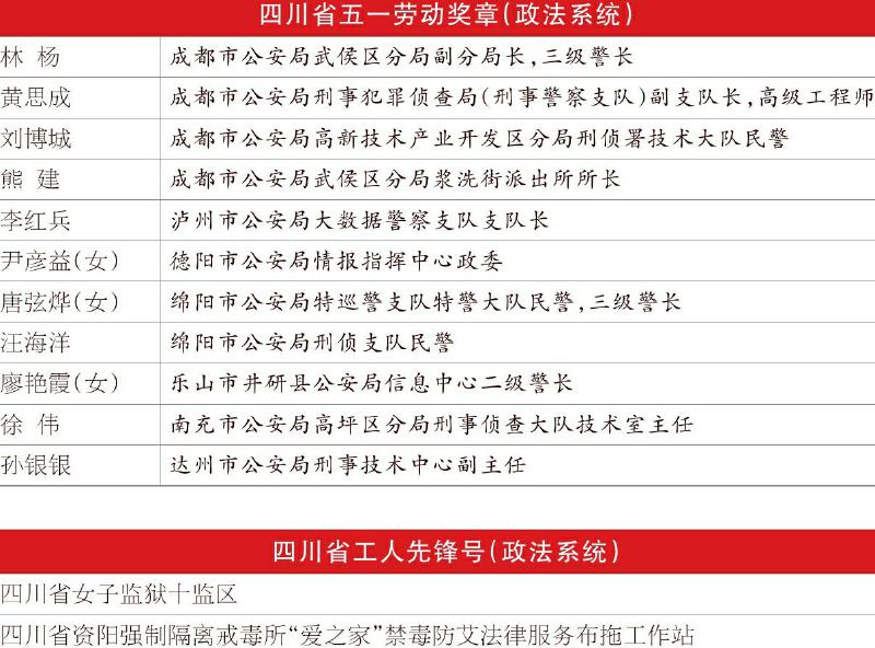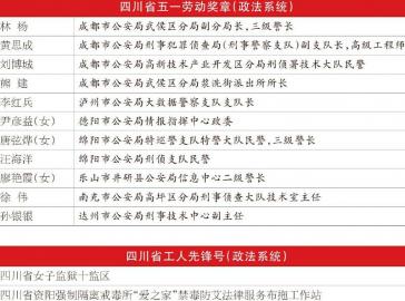 本报讯(四川法治报全媒体记者 张磊)28日,2024年四川省庆祝“五一”国际劳动节暨表彰大会在成都举行。为表彰先进,树立榜样,进一步激励全省广大职工的积极性和创造性,省总工会决定,授予中电科航空电子有限公司等89个单位“四川省五一劳动奖状”称号,授予苏立民等195名职工“四川省五一劳动奖章”称号,命名成都飞机工业(集团)有限责任公司材料应用技术室等99个集体“四川省工人先锋号”称号。其中,我省政法系统11名个人、2个集体荣获表彰。