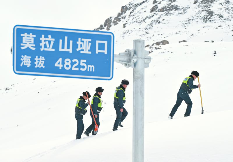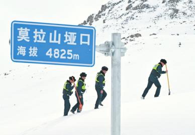 在海拔4825米的莫拉山垭口,交警们前往积雪严重路段除雪保畅