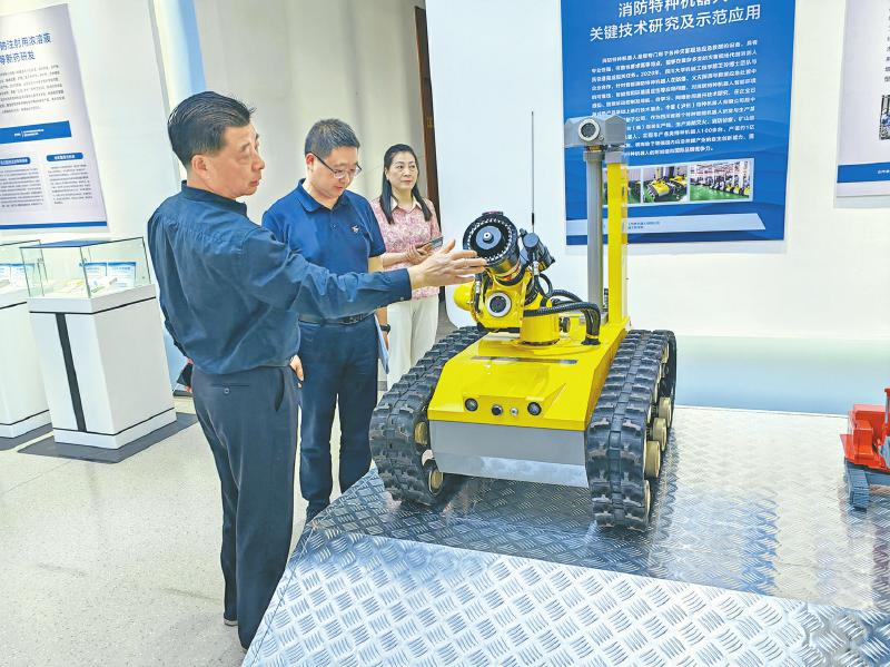 “现在为大家展示的是四川大学与中重(泸州)特种机器人有限公司合作研发的一款消防特种机器人,它能够在火灾等复杂多变的灾害现场代替消防人员快速完成应急救援任务,是我们泸州推动科技成果转化落地的代表成果之一。”5月15日,在四川大学泸州产业技术研究院,一个浑身金黄、脚踏履带、形似坦克的特种机器人吸引了执法检查组的注意,大家纷纷上前近距离观摩其构造设计。