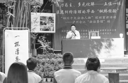 本报讯(赵霞 文/图)27日,“四川十大法治人物”巡回宣讲活动(泸州站)在合江县尧坝法治茶馆举行,2023年度“四川十大法治人物”四川润方律师事务所主任何长升、四川大学华西医院医务部综合科科长冉隆耀应邀授课,泸州基层一线法治建设骨干80余人聆听宣讲。