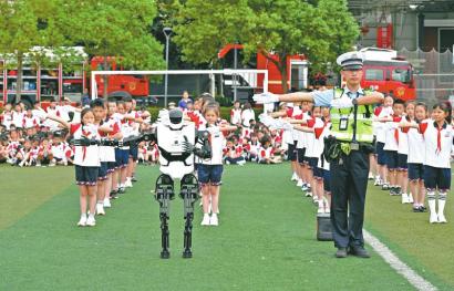 “交通机器人劝导员”和“小交警”们共做交通手势操