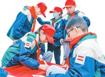 孩子们在横幅上签下名字,承诺做遵纪守法好学生