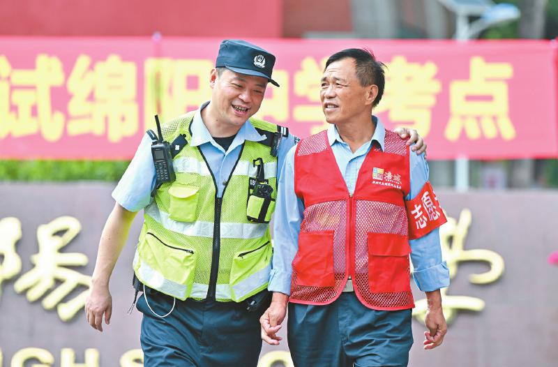 7时30分,老徐父子俩在绵阳中学考点外汇合。8时,随着考场外的考生和家长越来越多,小徐带领民辅警在绵阳中学大门前开展定点执勤和徒步巡逻。