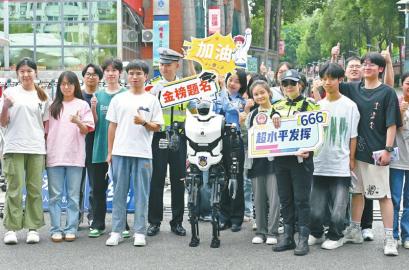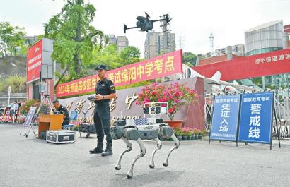 高考期间,绵阳全市公安特巡警、交警、各考点辖区公安派出所都投入了精干警力。公安交警在考点及重点交通路段指挥车辆有序通行、有序停放,保障道路交通顺畅;特巡警、派出所民警协同联动,在考点考场定人定岗执勤,服务考生出入场秩序。此外,巡逻机器狗、交通劝导机器人等警务“黑科技”也出现在考场外,帮助民辅警及时有效处置可能影响考试的隐患,确保考场及周边治安持续稳定。