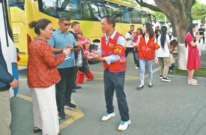 9时,考试开始后,考场外有许多考生家长等候着孩子们,老徐便带着矿泉水提供给有需要的人,同时协助小徐维护现场的秩序。