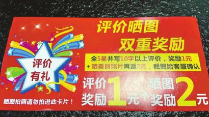“经常网购商品,到货以后里面都会有一张红色的卡片,写着‘联系客服带图好评返现3元’。”市民刘先生向记者说道。抱着试一试的态度,他按照卡片上的内容给出好评,联系客服之后,对方果然发来3元红包。在刘先生所说的店铺内,记者看到,该款商品已有近2000条评价,全部是好评,而且排在前列的评价全部是带图的。