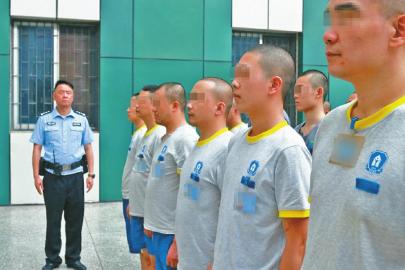 小宇(前排右二)在戒毒所内进行日常队列训练