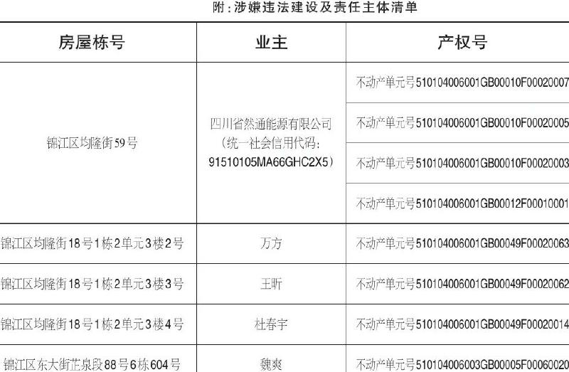 成都市锦江区均隆街18号、均隆街59号和东大街芷泉段88号6栋604号涉嫌违法建设责任主体(详情附清单):