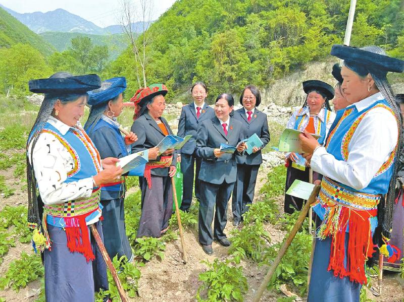 白龙江林区法院干警走进田间地头,用藏汉双语向少数民族群众开展法治宣传 受访单位供图