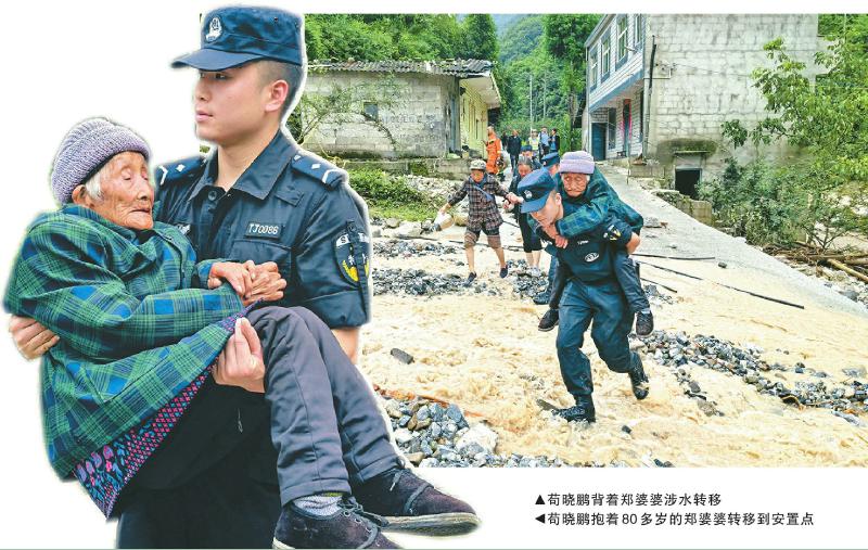 7月20日凌晨2时30分许,雅安市汉源县马烈乡新华村因暴雨突发山洪灾害,通信、道路、桥梁中断,雅安公安立即赶赴现场救援并转移受灾群众。今年24岁的苟晓鹏是救援力量中的一员,他加入公安队伍工作三年多了,除了这次救援外,此前还参加过石棉地震的救援工作。