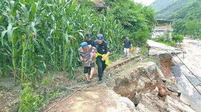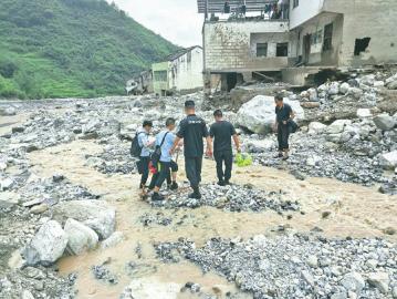 湍急的河水没有阻挡住他们的脚步。过不去的地方,他们就搭牵引绳爬上去,“你拉我一把,我推你一把。”郝丹说。每到一个村落,他们都要彻底搜索房屋,并将群众带到安全区域。直到20日16时,民辅警们才将最远的新华村8组情况了解清楚,并把群众妥善转移集中到安全区域。