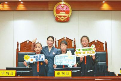 “小朋友们,你们知道这个法槌是怎么用的么?”在审判庭内,法院干警向孩子们详细介绍了法徽、法袍、法槌及审判席等功能,并带领孩子们开展了一次“模拟庭审”。