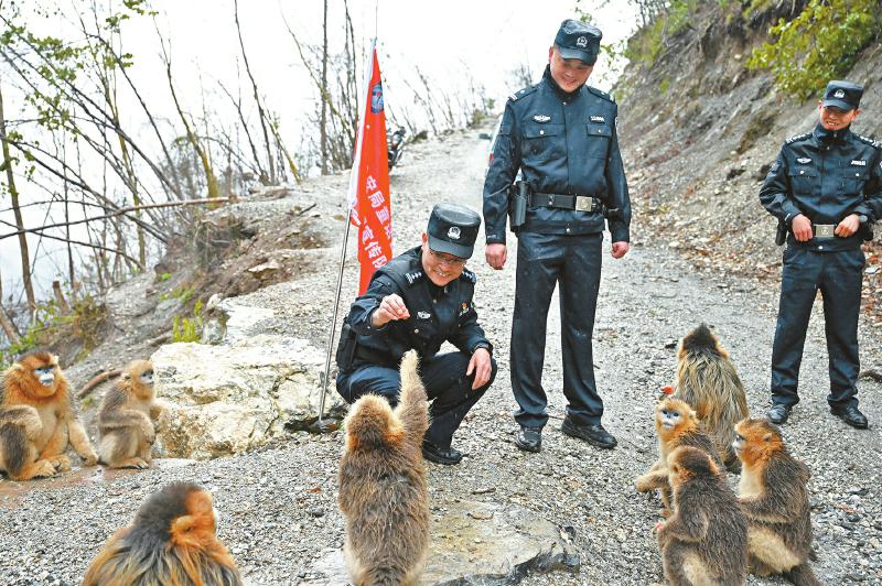 九寨沟县公安局民警在巡逻时与金丝猴相遇,向其投喂胡萝卜 省公安厅供图