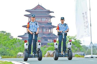 东部新区公安世园会园区警务队队长马廷良(左)和同事驾驶警用平衡车在园区内巡逻