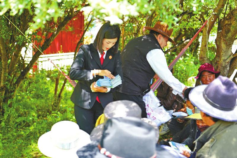 “石榴籽”调解工作室的巡回法治宣讲很有烟火味,夏季多以坝坝会、帐篷宣讲为主,主讲人是对23个乡镇情况了如指掌的“老益法官”,即益西登真。他操着一口纯正的藏语,盘腿一坐,开展宣讲就是几个小时,很多牧民群众在讲堂上“喜欢倾听、更喜欢倾诉”。“在‘耍坝子’的氛围里学习法治知识,太美妙了!宣传手册有德格特色、藏文化特色,我们农牧民都很喜欢,更容易接受法治宣传教育。”中国藏族传统手工艺之乡德格县麦宿镇的卓玛拉姆说。