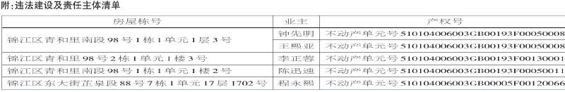成都市锦江区青和里南段98号和锦江区东大街芷泉段88号违法建设责任主体(详情附清单):你位于成都市锦江区青和里南段98号和锦江区东大街芷泉段88号院落的房屋在产权面积外扩建的建(构)筑物,不能出示相关规划审批等合法手续,违反了《中华人民共和国城乡规划法》第四十条之规定。根据《成都市违法建设查处工作规定》,我局已于2024年8月21日发出强制拆除违法建设决定书,如你(单位、个人)对此有异议,可自公告送达之日起5日内到我局进行陈述申辩,逾期未至视为放弃陈述申辩权利,以我局调查为准,不影响案件的调查和处理。因其他方式无法向你送达,现依法公告。
