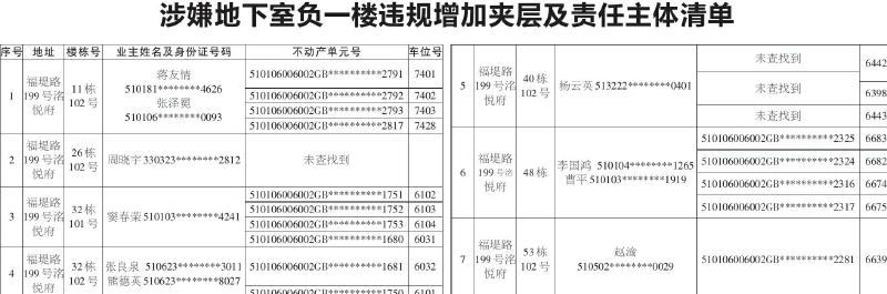 成都市金牛区五块石福堤路199号电建洺悦府小区涉嫌未取得《房屋结构安全批准书》在停车位上增加夹层。(具体涉嫌的房屋栋号、地下室负一楼停车位号及责任主体业主姓名详见本公告后附的清单):