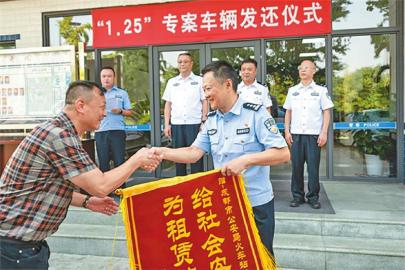 8月28日上午,成都市公安局火车站地区分局在成都东站东客站地区派出所举行涉案车辆发还仪式,将追回的总价值近131万元的3辆汽车发还车主。租车公司为表达谢意,向办案单位和民警赠送了牌匾和锦旗。