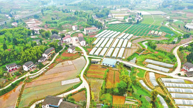 群山绿树环抱间,一座座整洁的川东民居高低错落。沿着平整的硬化路面一路前行,路边绿油油的水稻垂着饱满的穗子,黄瓜、茄子、西红柿等蔬菜藏身在整齐划一的温室大棚中,静静酝酿着下一场丰收。
