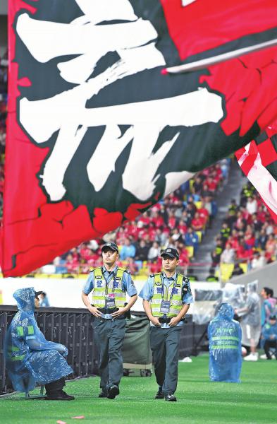 执勤警力在看台通道巡逻,严防发生抛撒杂物、翻越护栏等行为