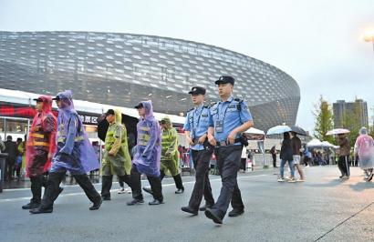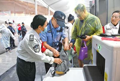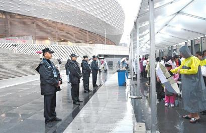 民辅警在安检口冒雨执勤,确保球迷有序进入场馆
