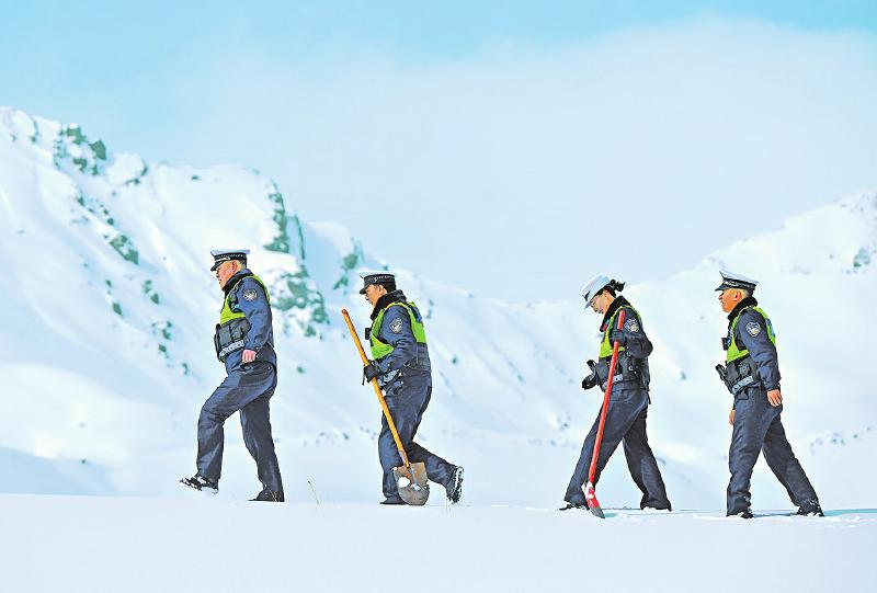 海拔4825米的莫拉山垭口积雪严重,石渠县公安局交警大队民辅警上路除雪保畅 石渠县公安局供图