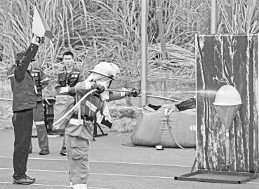 参赛选手在专业综合技能竞技中进行水枪操作 省森防指办供图