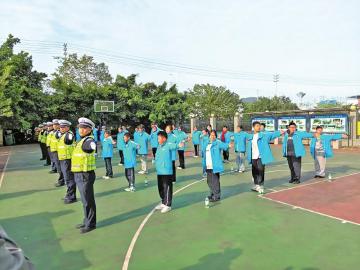 12月2日,遂宁市公安局交通警察支队直属二大队邀请川师附校初一学生走进警营,图为交警带领同学们学习交通指挥手势
