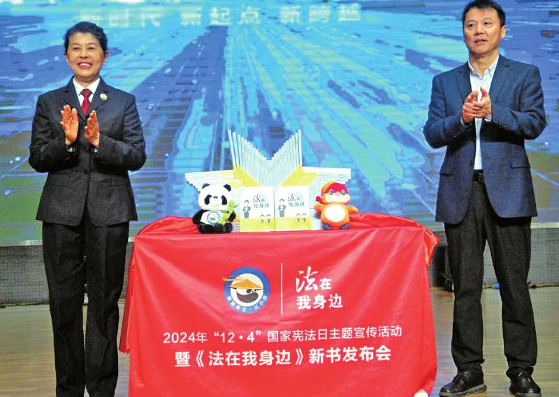 本报讯(李莎 佘乙萍 王美惠 赵银熙 文/图)3日上午,江油市检察院联合四川大学出版社主办的“2024年‘12·4’国家宪法日主题宣传活动暨《法在我身边》新书发布会”在江油外国语学校举行。发布会上,江油外国语学校党委书记、校长勾红蔚致欢迎辞。江油市委常委、政法委书记、社会工作部部长李海,江油市检察院党组书记、检察长黄菊蓉共同发布全省首本由检察机关编印的法治教育出版读物《法在我身边》,并向11所学校赠送读本。